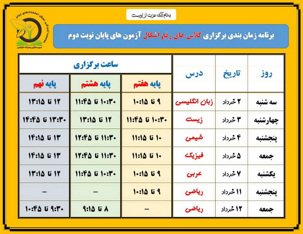 امتحانات نوبت دوم از تاریخ 30 اردیبهشت ماه لغایت 24 خردادماه برگزار گردید همچنین با برنامه ریزی دبیرستان ، دانش آموزان در کلاس های رفع اشکال ، برای آمادگی هرچه بهتر در امتحانات شرکت نمودند .