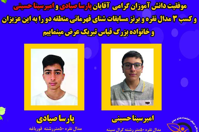 با اعزام دو نفر از دانش آموزان به مسابقات شنای منطقه دو ، آقای پارسا صیادی و امیرسینا حسینی مجموعا سه مدال طلا و مقره کسب کردند.