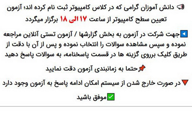 ثبت نام درکلاسهای کامپیوتر پنج شنبه ها که بصورت غیرحضوری خواهد بود ، آغاز کردید مقرر شد پس از پایان ثبت نام ، دانش آموزان در یک آزمون تعیین سطح شرکت کنند تا نسبت به سطح بندی آنها اقدام شود تا کلاسها در سه سطح آغاز شود.