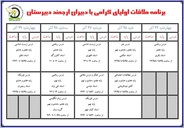 برابر با تصمیم مدیریت دبیرستان برابر با جدول داده شده برنامه ملاقات با دبیران صورت گرفت ، اولیا به دبیرستان مراجعه نمودند ، نقطه نظرات اساتید را شنیدند ، در مورد دانش آموزشهایشان نکات خاصی بیان شد، برنامه ریزی جدیدی صورت گرفت تا اشکالات دانش آموزان برطرف شود.