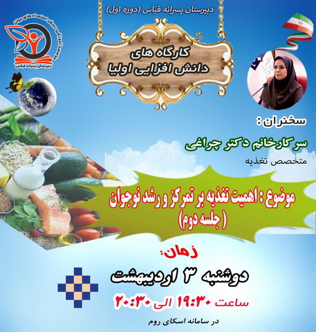 قسمت اول در جلسه قبلی انجام شده بود . خانم دکتر چراغی عضو تیم تغذیه دانشگاه تهران سخنگوی جلسه بودند که موارد بسیار مهمی را با اولیای عزیز به اشتراک گذاشتند. ضمنا انتهای جلسه پرسش و پاسخدرنظر گرفته شد تا اولیا سوالهایشان را از خانم دکتر بپرسند.